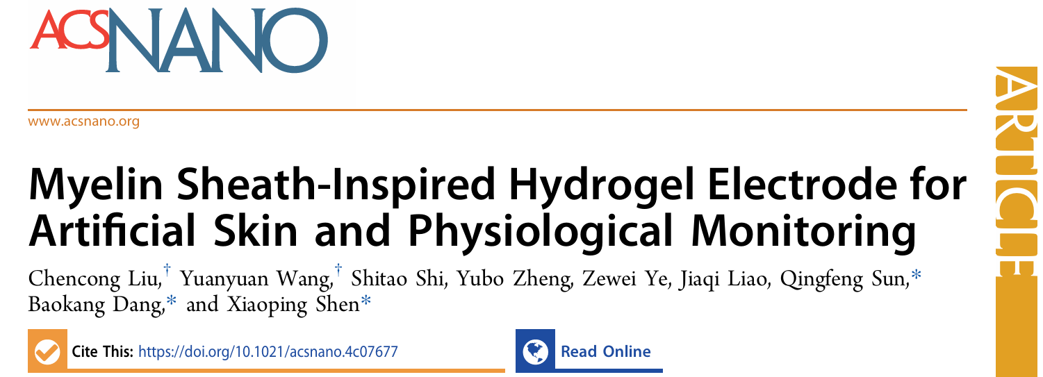 9月27日,林业工程学科生物质仿生智能研究团队在纳米材料领域国际期刊《ACS Nano》(中科院1区Top,IF=15.8)在线发表题为《用于人造皮肤以及生理信号监测的髓鞘启发水凝胶电极》(Myelin sheath-inspired hydrogel electrode for artificial skin and physiological monitoring)的研究论文。该团队本科生柳晨聪为本文第一作者,beat365平台唯一官网化学与材料工程学院为该论文第一单位和通讯作者单位。