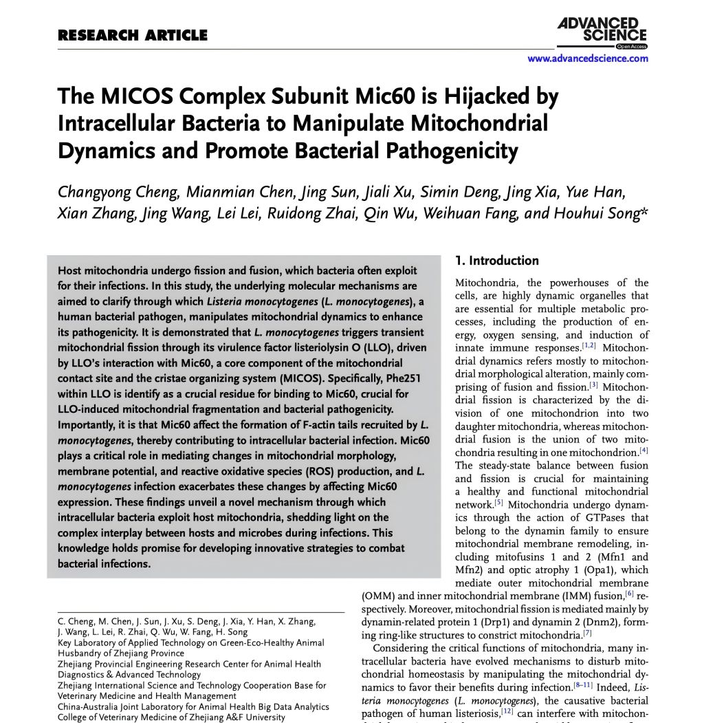 近日,动科动医学院同一健康与交叉前沿学科研究团队在国际权威期刊《Advanced Science》(中科院一区TOP期刊,IF5-year:16.3)发表了题为“The MICOS complex subunit Mic60 is hijacked by intracellular bacteria to manipulate mitochondrial dynamics and promote bacterial pathogenicity”(《胞内病原菌通过操纵宿主线粒体接触位点和嵴组织系统(MICOS)亚基Mic60调控线粒体结构变化并介导细菌的致病性》)的最新研究论文。动科动医学院程昌勇教授为论文第一作者,宋厚辉教授为论文通讯作者。该研究得到了国家重点研发计划青年科学家项目、国家自然科学基金、浙江省自然科学基金等项目的支持。