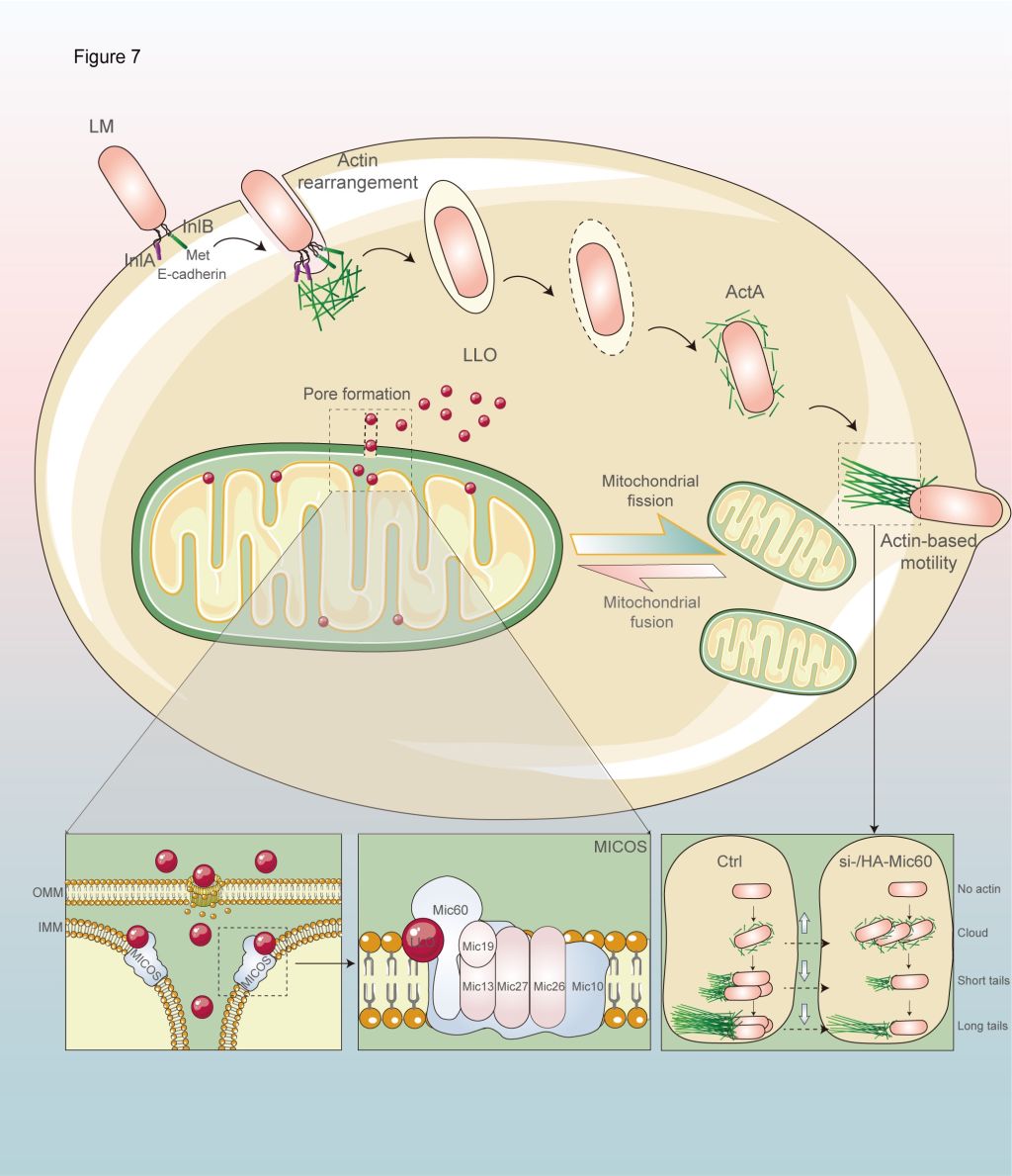 该研究聚焦重要人兽共患胞内病原菌——单增李斯特菌,系统探索了病原在感染过程中与宿主线粒体的调控关系,首次揭示了细菌重要毒力因子与线粒体接触位点和嵴组织系统(MICOS)复合物的互作分子机制。