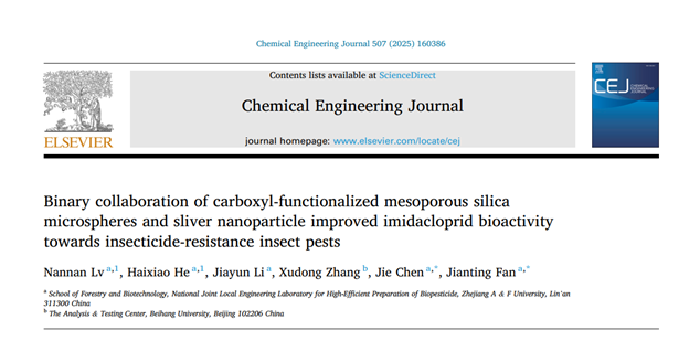 近日,林业与生物技术学院绿色农药团队在化学领域国际权威期刊《Chemical Engineering Journal》(化学工程杂志)(中科院1区TOP,五年影响因子:13.2)上发表了题为“Binary collaboration of carboxyl-functionalized mesoporous silica microspheres and sliver nanoparticle improved imidacloprid bioactivity towards insecticide-resistance insect pest”(《羧基功能化介孔二氧化硅纳米微球与纳米银颗粒的二元协同作用提高吡虫啉对抗性害虫的生物活性》)的研究论文。青年教师吕楠楠和硕士研究生何海啸为论文共同第一作者,樊建庭教授和陈杰教授为通讯作者。beat365平台唯一官网林业与生物技术学院为该论文第一单位和通讯作者单位。
