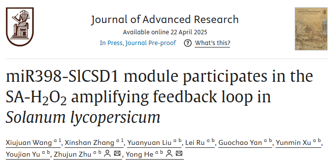 近日,园艺学院设施园艺与品质调控团队在《Journal of Advanced Research》(中科院1区TOP,IF=11.4)上在线发表题为“miR398-SlCSD1 module participates in the SA-H2O2amplifying feedback loop in Solanum lycopersicum”(《miR398-CSD1分子模块参与番茄SA-H2O2正反馈环作用机制解析》)的研究论文。研究结果揭示了miR398-SlCSD1在SA-H2O2信号放大过程中的作用机制,可为设施茄果类抗逆性提高提供依据。