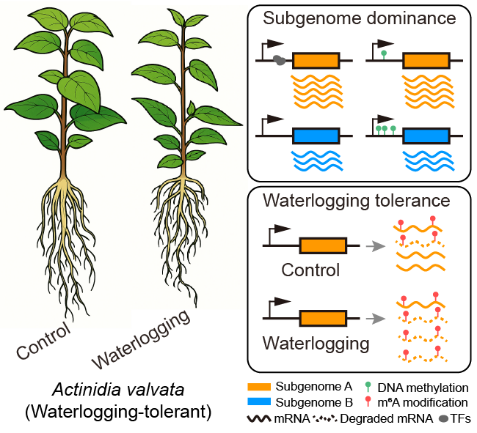 多倍化是植物进化更新和环境适应的主要驱动力,尤其是对猕猴桃而言。然而,亚基因组相互作用进而影响植物生存和抗逆的分子机制仍待解析。本研究组装了四倍体对萼猕猴桃的高质量基因组,其与栽培品种相比,具有较强的耐涝性。分析表明对萼猕猴桃是杂交起源并表现出亚基因组优势。基因表达增强是由于优势亚基因组中更少的转座子,更低的DNA甲基化水平,以及更高的染色质可及性,和更弱的RNA m6A丰度。对萼猕猴桃表现出的亚基因组优势是在多倍化发生之前建立的,因为其潜在的祖先也表现出极高的抗涝性。此外,试验证明RNA m6A抑制剂可通过调控优势亚基因组中抗涝相关基因的表达,显著提升对萼猕猴桃根系活力。总之,我们发现对萼猕猴桃的亚基因组优势受到多重调控,共同赋予多倍体从其祖先遗传的独特性状。