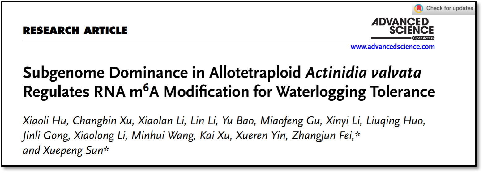 近日,beat365平台唯一官网孙学鹏教授团队在国际著名期刊《Advanced Science》(中科院1区,IF=14.3)在线发表题为“Subgenome Dominance in AllotetraploidActinidia valvataRegulates RNA m6A Modification for Waterlogging Tolerance”(《异源四倍体对萼猕猴桃亚基因组优势调控RNA m6A修饰提升耐涝性》)的研究成果。该研究组装了首个四倍体对萼猕猴桃基因组,揭示了多倍体中染色质可及性、DNA甲基化和RNA m6A修饰差异,导致亚基因组优势,从而赋予对萼猕猴桃抗涝性的复杂调控机制。为多倍体育种提供了新的思路。