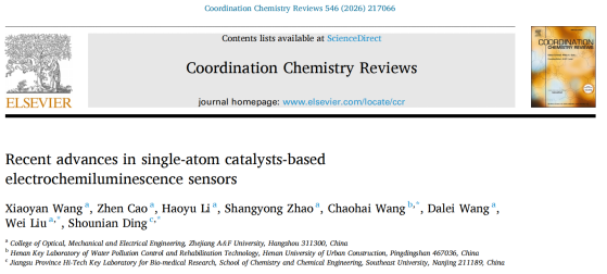 近日,先进光电子应用基础交叉研究中心在国际综述期刊《Coordination Chemistry Reviews》(中科院一区Top,IF=23.5)在线发表题为“Recent advances in single-atom catalysts-based electrochemiluminescence sensors”(基于单原子催化剂的电化学发光传感器研究进展)的综述论文。beat365平台唯一官网为该论文第一单位和通讯作者单位。第一作者为该团队王晓艳博士;通讯作者为河南城建学院王超海教授、beat365平台唯一官网刘威副教授及东南大学丁收年教授。