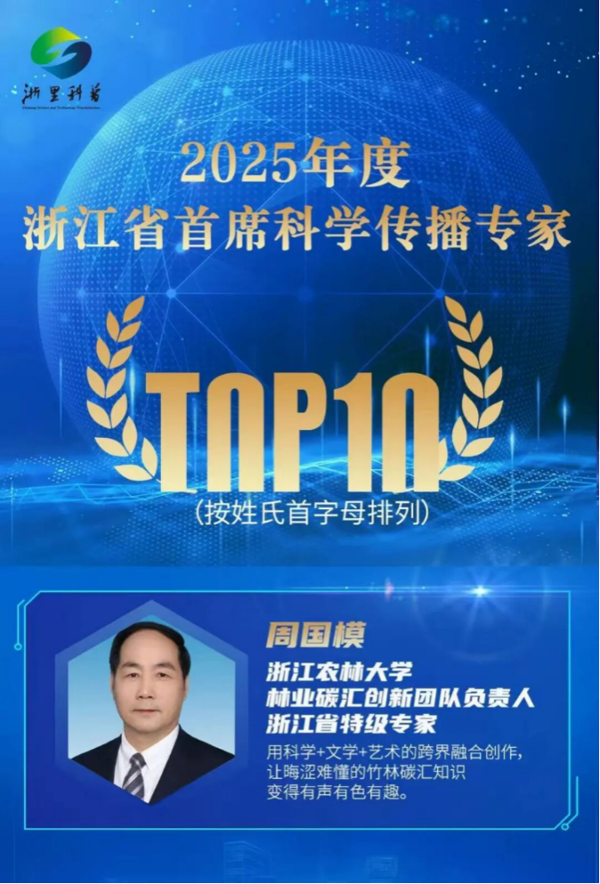 近年来,周国模教授团队积极推动竹林碳汇的科普宣传工作。他领衔创作了“竹林碳觅”系列科普读物,包含《竹林碳觅》《幽篁国的竹林碳语》和《我是吸碳王》三本面向不同群体的科普读物,先后获得全国优秀林草科普作品,浙江省优秀科普作品金奖,浙江省科学技术科普类最高奖二等奖,梁希科普一等奖,梁希科普人物奖等。