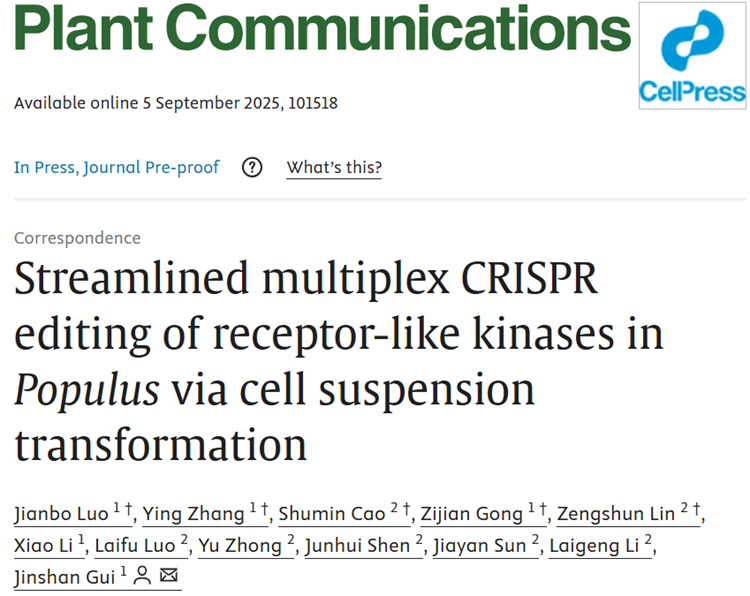 近日,beat365平台唯一官网桂金山教授团队在国际知名期刊《Plant Communications》上发表了题为“Streamlined multiplex CRISPR editing of receptor-like kinases inPopulusvia cell suspension transformation”(《通过细胞悬浮系转化实现杨树受体激酶的高效多重CRISPR编辑》)的研究论文。该研究成功建立了一种基于叶片直接诱导悬浮细胞的高效CRISPR基因编辑平台,突破杨树高通量多基因编辑的技术瓶颈,实现了受体激酶(RLKs)大规模突变体库的快速构建,为林木功能基因组学研究和分子育种提供强有力的技术支撑。