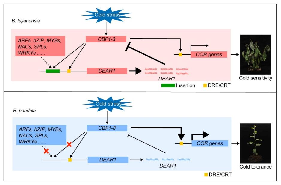 图:桦木DEAR1变异调控种间低温适应性分化的模型