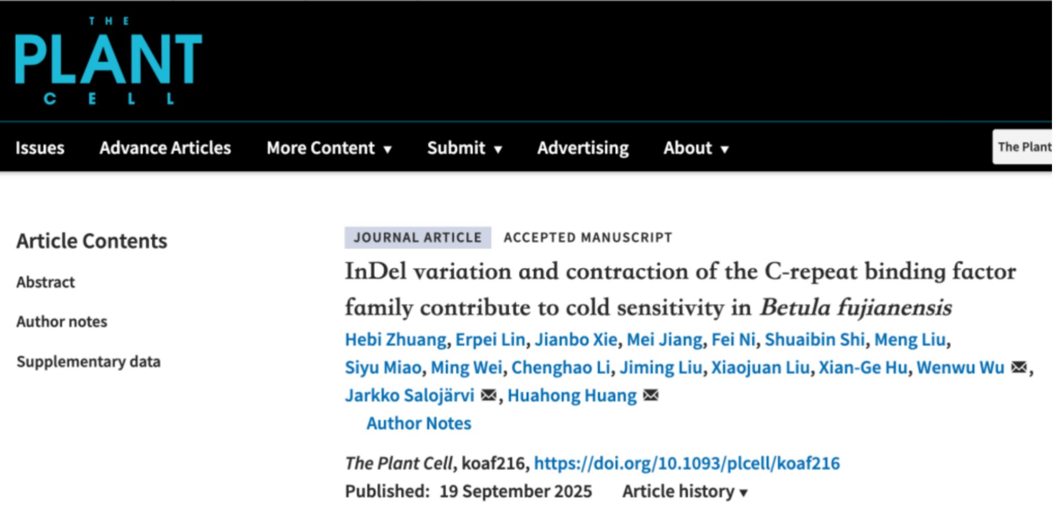 近日,林生院黄华宏教授课题组在国际知名植物学期刊《The Plant Cell》(中科院1区,IF=11.6)上发表了题为“InDel variation and contraction of the C-repeat binding factor family contribute to cold sensitivity inBetula fujianensis”(《序列插入缺失变异和CBF转录因子家族收缩导致闽桦低温敏感性》)的研究论文。该研究通过对濒危树种闽桦进行近端粒到端粒水平的基因组组装,整合比较基因组学、保护基因组学及分子生物学等多种研究方法,系统阐明了闽桦低温敏感性形成的遗传机制与其种群濒危的基因组基础,并据此提出了针对性的保育策略,为桦木属植物的资源保育与可持续利用提供了重要理论依据。