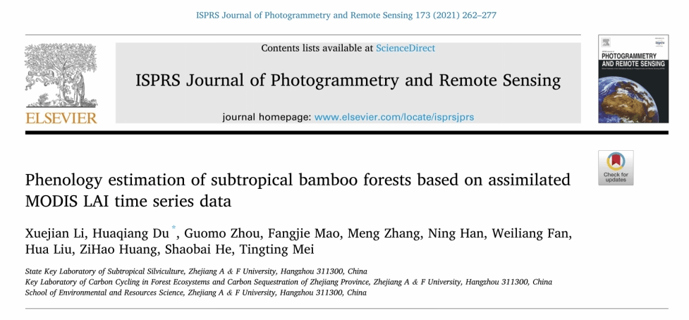 近日,国家重点实验室森林碳汇研究团队遥感领域国际顶级期刊《ISPRS Journal of Photogrammetry and Remote Sensing》(IF=8.979)发表题为“Phenology estimation of subtropical bamboo forests based on assimilated MODIS LAI time series data”的研究论文。该研究创新构建基于LAI同化的竹林SOS(生长季开始)和EOS(生长季结束)遥感反演模型,解决了传统植被指数EVI无法反演亚热带竹林物候的难题,初步探明了竹林物候的时空演变趋势,为深入研究竹林碳汇功及形成机制能提供了极为重要的关键参数。