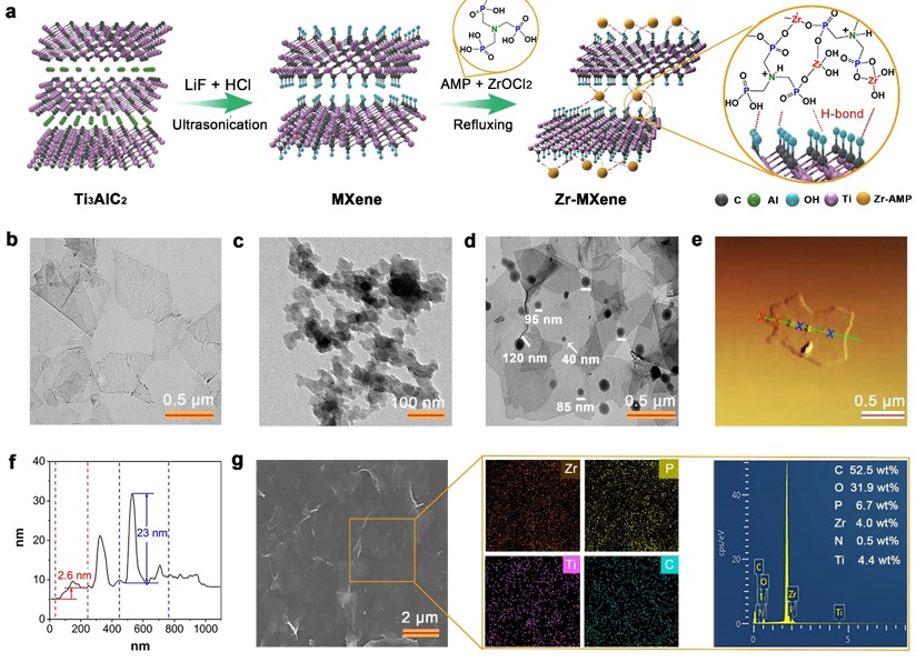 该研究通过原位法制备一种新型功能化MXene纳米二维材料,将纳米Zr-AMP负载其表面,制得具有阻燃性能的杂化物Zr-MXene。通过溶剂法和熔融共混法将Zr-MXene均匀分散于热塑性聚氨酯TPU基体中。研究结果表明,与TPU纯样相比,添加1 wt% Zr-MXene的TPU/1Zr-MXene,其延展性提高了33%,韧性提高了88%,达到了TPU迄今为止的最高延展性和韧性。同时,拉伸强度和抗疲劳性能也有一定的提高。这种同时提高强度、延展性和韧性的材料远优于从前,因为MXene纳米片层良好的界面和H-键相互作用和机械增强。此外,对TPU的热释放和烟释放显著降低,是由于MXene的阻隔效应与Zr-AMP的催化碳化和稀释效应协同作用的结果。本工作中的阻燃设计表明Zr-MXene改性的TPU纳米复合材料具有良好的拉伸性能、韧性、抗疲劳和阻燃性能,有望在交通运输、电气和织物等领域得到广泛应用。