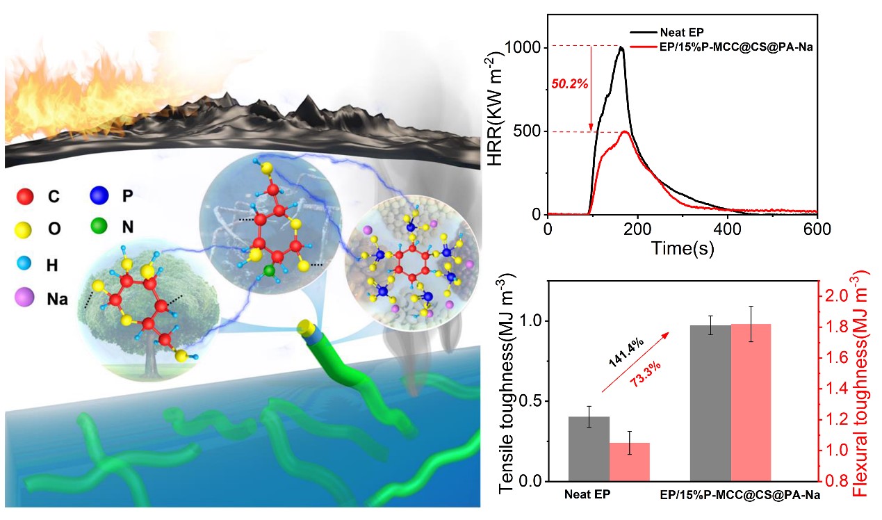 该研究以天然纤维素为原料,引入磷酸基团,壳聚糖以及植酸钠,通过磷酸化和层层自组装,合成一种“芯鞘”结构的全生物基阻燃剂。在环氧树脂中可显著提高阻燃性能,15wt%添加量时,环氧树脂的热释放速率峰值(pHRR),总热释放(THR),烟释放速率峰值(pSPR)以及总烟释放(TSP)分别下降了50.2%,25.7%,38.5%和38.6%;极限氧指数从20.4%提升至26.2%。此外,该纤维素基阻燃基与环氧树脂具有良好的相容,在同样的添加量下,其拉伸强度,弯曲强度和冲击强度分别提高了30.7%,34.2%和40.3%。该项研究工作为多功能生物基阻燃剂的绿色制备提供了一种创新思路。