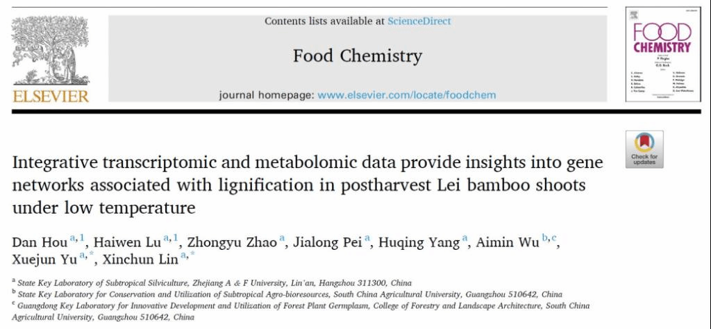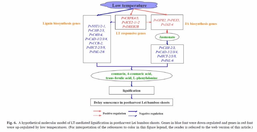 近日,国际知名学术期刊Food Chemistry(IF=7.514)在线发表了国家重点实验室竹子研究团队题为“Integrative transcriptomic and metabolomic data provide insightsinto gene networks associated with lignification in postharvest Lei bamboo shoots under low temperature”的研究论文。该研究提出低温可能通过直接抑制,或通过诱导茉莉酸合成来间接抑制木质素合成基因表达,进而降低采后雷竹笋木质化来延缓其衰老。