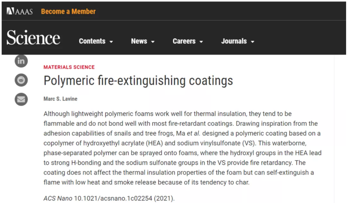 马哲文和徐潇东作为共同第一作者撰写的论文“Bioinspired, Highly Adhesive, Nanostructured Polymeric Coatings for Superhydrophobic Fire-Extinguishing Thermal Insulation Foam”于2021年6月25日发表在化学与材料领域高水平国际期刊《ACS Nano》(IF=15.881)上,指导老师为澳大利亚南昆士兰大学宋平安教授。该研究论文被国际顶级学术期刊《Science》以“Polymeric fire-extinguishing coatings”为题在Editors’ Choice中进行推荐报道。