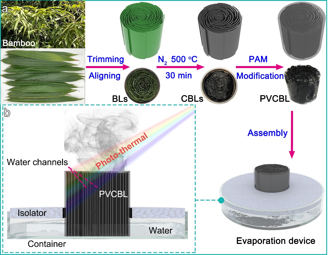 该成果以计算机光路模拟为指导,利用碳化竹叶(CBLs)构造了一种新的光吸收结构。接着利用聚丙烯酰胺(PAM)对该结构进行了修饰,制成集光吸收、光热转化和水传输三大功能于一体的太阳能界面水蒸发器(PVCBL)。一方面,该蒸发器可利用竖直排列的片状竹叶衍生碳结构扩展光路,增加吸光面积,因而具有出色的光吸收性能。另一方面,在竖直排列的CBLs之间连续分布的PAM水凝胶可以作为垂直通道,支持水的高速运输,并且缩短水蒸发路径。因此,该蒸发器的平均光吸收率达到~96.1%,其在一个太阳(1 KW m-2)光照下的水蒸发速率为1.75 kg m-2h-1,光-汽转化效率高达91.9%。另外,基于该蒸发器的蒸发设备在完成水蒸发的同时,可同步实现海水淡化、重金属离子移除、以及染料分离。此外,该设备适用于户外,并具备重复循环使用的能力。该研究工作为利用生物质材料实现高效太阳能水蒸发和协同水处理提供了一种创新思路。
