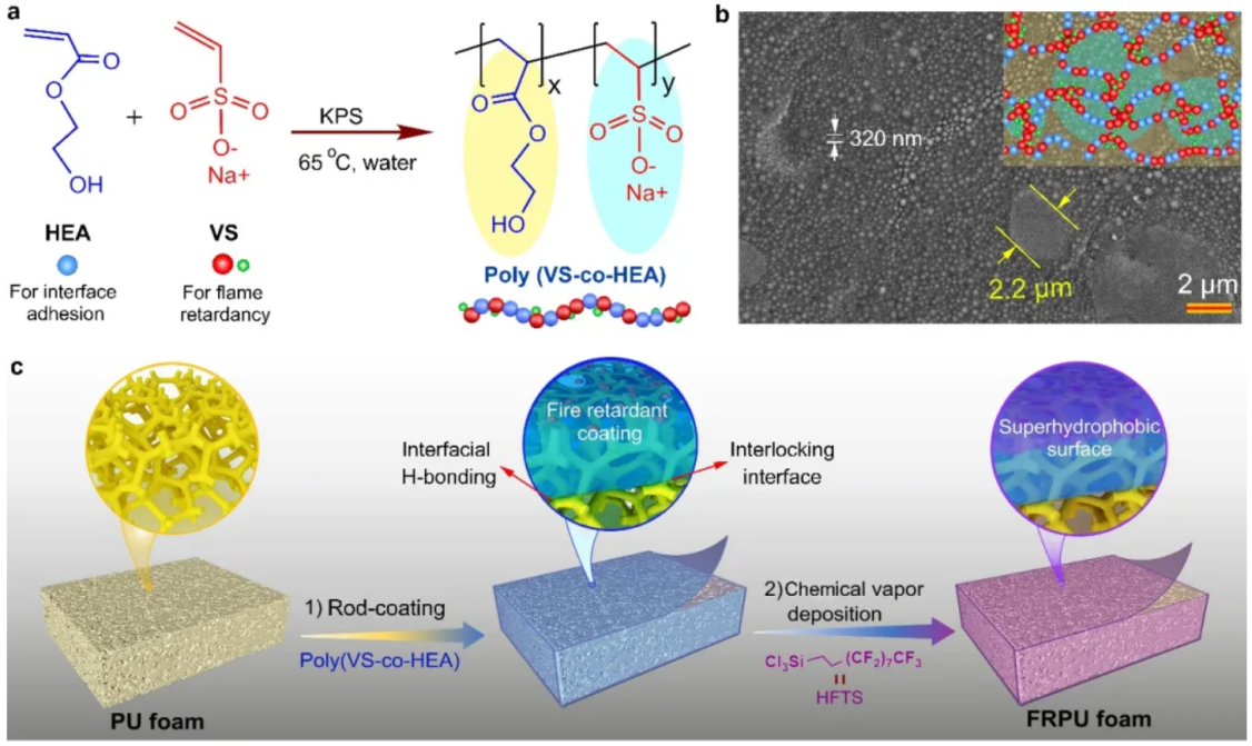 该成果受自然界中蜗牛与树蛙粘附机制的启发,以丙烯酸羟乙酯(HEA)和乙烯基磺酸钠(VS)为原料,通过自由基共聚,合成了一种水性poly(VS-co-HEA)共聚物。共聚物中丰富的羟基通过界面氢键使其具有很强的界面附着力。同时VS中的磺酸钠基团提供了阻燃性,并诱导产生了能与聚氨酯(PU)表面产生机械互锁的相分离微/纳米结构。另外,通过对涂层的进一步疏水处理,可使其实现超疏水特征,降低其水敏感性。此外。除了高剪切粘结强度(>2.2 Mpa)外,经该共聚物处理的硬质聚氨酯泡沫塑料还表现出了高达35.5%的极限氧指数(LOI),达到了理想的UL-94 V-0等级,并且最大热释放速率(PHRR)(降低87%)和总烟雾释放量(TSR)(降低71%)显著降低,明显优于以往的阻燃PU泡沫塑料。