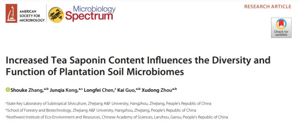 近日,国家重点实验室森林健康研究团队(周旭东教授课题组)在国际知名学术期刊Microbiology Spectrum(IF=7.171)发表了题为“Increased Tea Saponin Content Influences the Diversity and Function of Plantation Soil Microbiomes”的研究论文。该研究系统地探究了不同年限油茶种植园土壤茶皂素积累量、土壤理化性质以及土壤微生物群落结构与功能的关系问题,为提出合理的油茶种植园管理措施、绿色健康可持续的油茶栽培技术体系提供了数据支撑和理论基础。