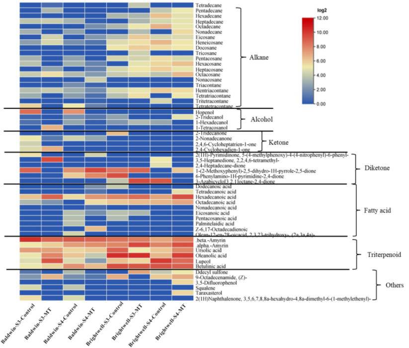 图3兔眼蓝莓果皮蜡质组分热图分析