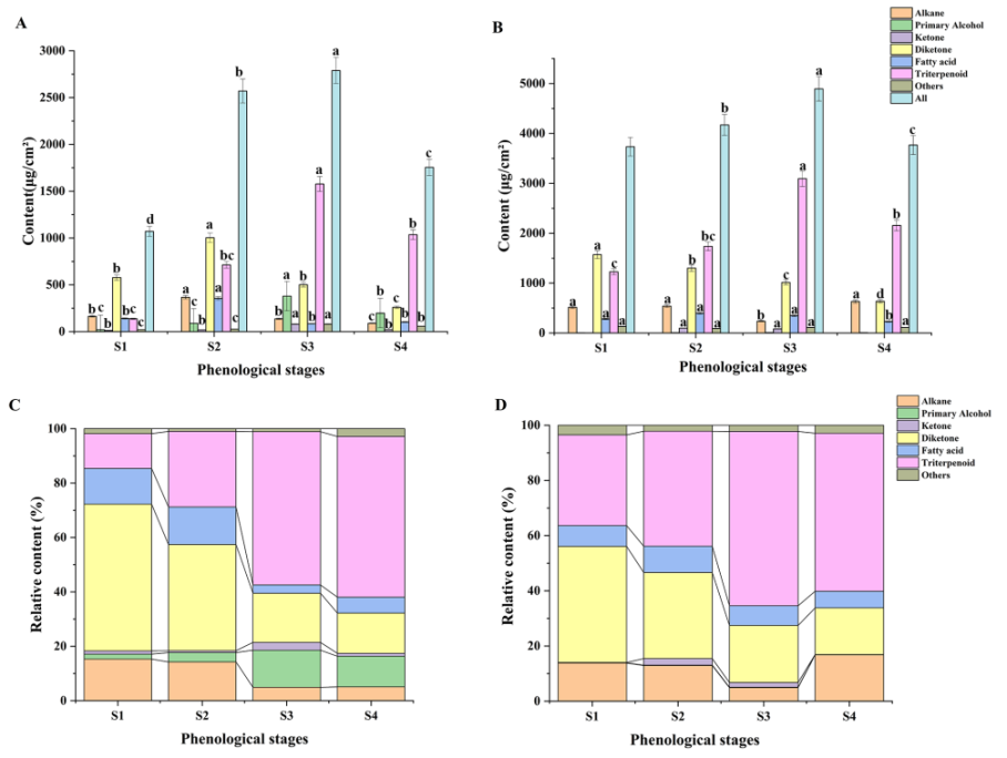 本研究共鉴定出56种蜡化合物。热图分析结果表明,各组分在不同果实发育阶段含量存在差异(图3)。并且,褪黑素对七大类蜡成分的含量有不同程度的影响。