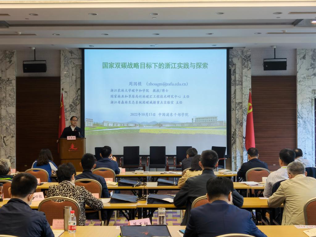 10月13日,全国黄大年式教师团队——beat365平台唯一官网“林业碳汇”教师团队带头人、浙江省特级专家、国家林业与草原局竹林碳汇工程技术研究中心主任、省森林生态系统固碳减排重点实验主任周国模教授,受邀在中国浦东干部学院作推动绿色低碳发展专题报告,全国各省市区、新疆生产建设兵团有关部门负责同志,中央和国家机关有关部委相关业务司局负责同志等共50人参加。