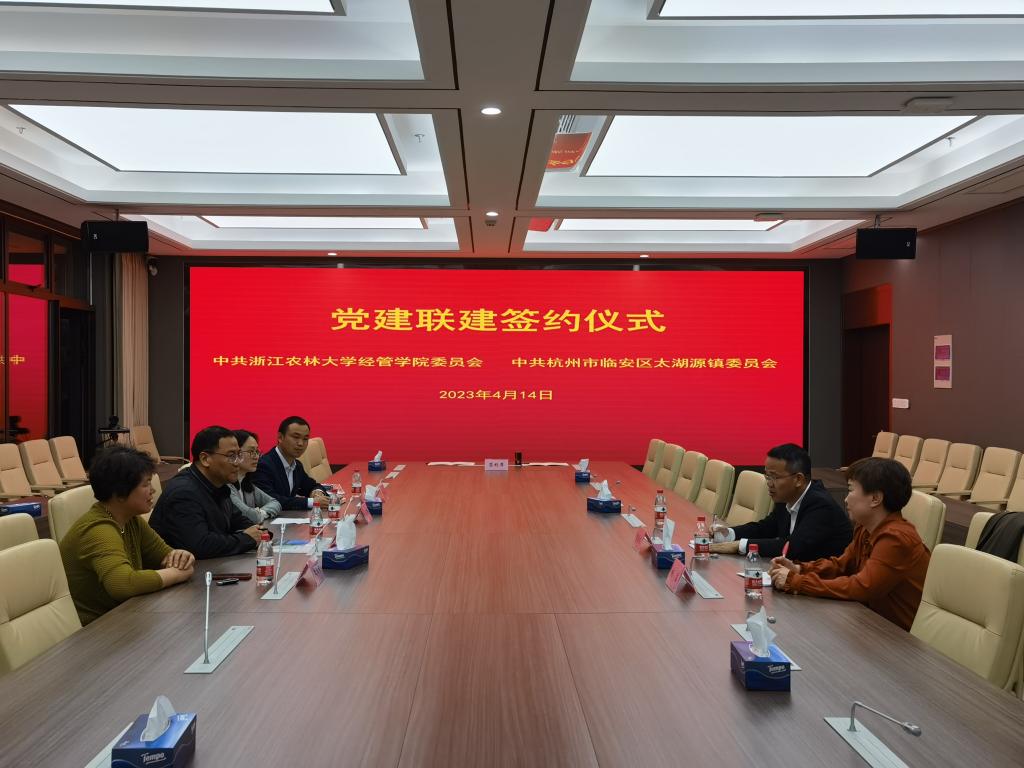 4月14日,经管学院党委与太湖源镇党委签订党建联建协议。经管学院党委书记周凯、太湖源镇党委书记曹源发等参加。