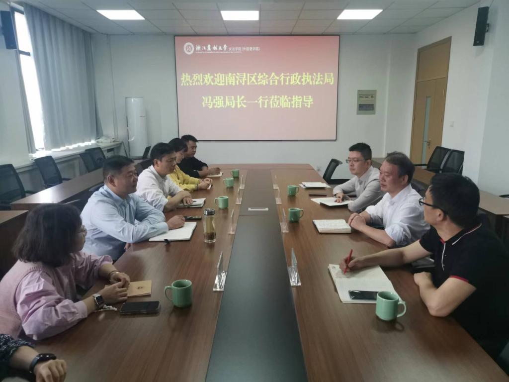 在65周年校庆之际,湖州市南浔区综合行政执法局局长冯强带队,到文法学院座谈交流。文法学院党委书记朱红东等学院相关负责人会见了冯强一行。