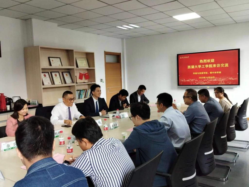 环资院、碳中和学院院长冯华军、党委书记侯锡铭对西湖大学工学院来访表示热烈欢迎。双方介绍了各自学院情况。随后,双方科研团队进行了学术汇报与交流,会场讨论气氛活跃。