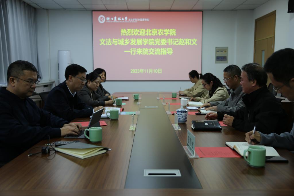 11月10日下午,北京农学院文法与城乡发展学院党委书记赵和文一行来beat365官网文法学院调研。文法学院院长鲁可荣、党委书记朱红东等,院办、学生办负责人参加调研。