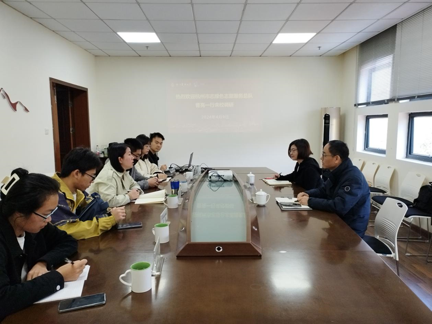 4月9日,杭州绿色志愿服务总队在杭高校绿色联盟负责人曹亮、周琴一行来校团委调研交流。校团委书记魏玲玲,校团委相关人员,校生态类社团、学生组织代表等参加交流。