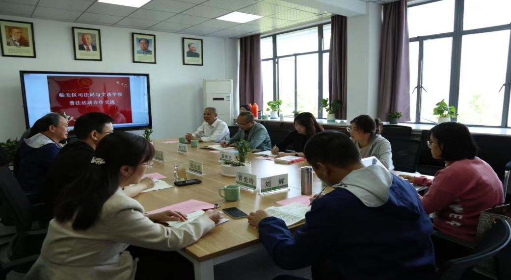 4月15日,临安区司法局副局长程万里一行到文法学院洽谈普法合作。文法学院党委书记朱红东等学院领导及法学学科教师代表参加座谈。