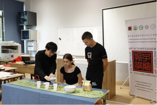 体验课开始前,Petro Kuzmjak中学学生表演了中文拍手歌和数字朗读,欢迎诺大孔院老师的到来。体验课展示了中国传统盖碗茶艺,讲解了中国茶文化中的“天人合一”和“公平正义”的哲学思想,让学生了解中国茶文化的内涵和精髓。学生在老师的指导下现场完成“中塞友谊万古长青”的书法作品。全体师生合唱《友谊天长地久》作为结尾,表达了中塞两国人民之间的深厚友谊和美好愿景。