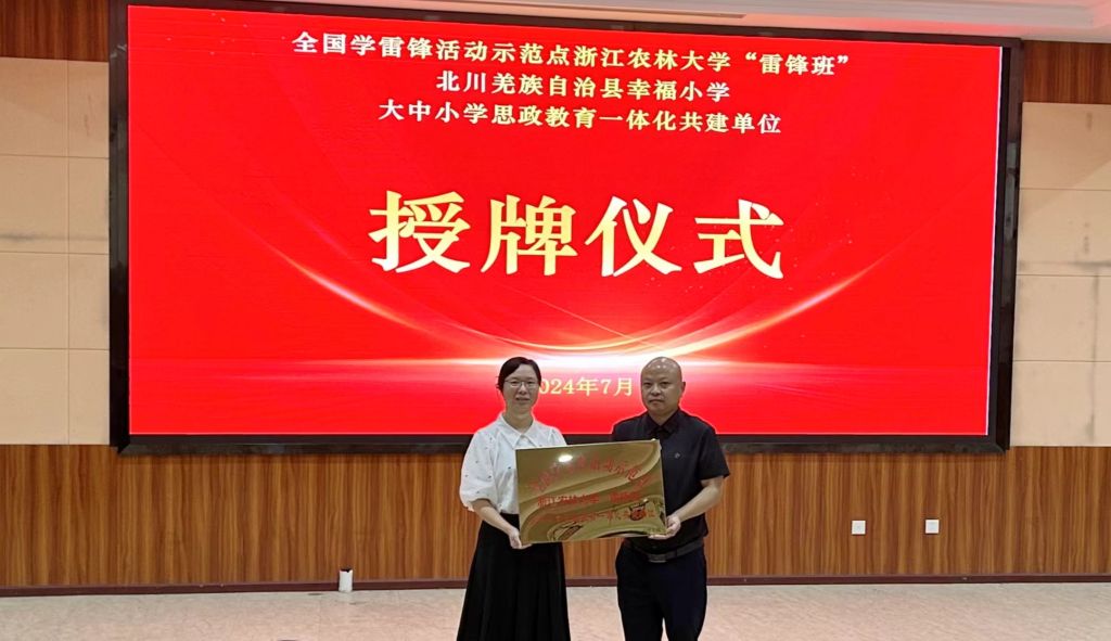 7月21日,beat365平台唯一官网雷锋班实践基地、雷锋班与北川羌族自治县幸福小学大中小学思想政治教育一体化共建单位的授牌仪式在幸福小学报告厅举行。幸福小学党总支书记唐荣生、校长张斌等领导,文法学院农村发展硕士点负责人、雷锋班党支部书记及相关师生代表参加活动。