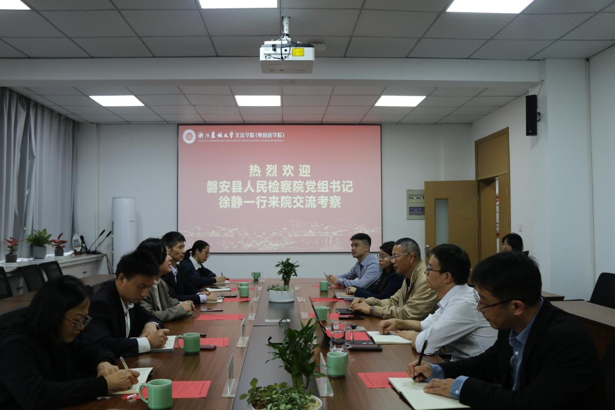 11月15日,磐安县人民检察院党组书记徐静一行来文法学院交流合作。文法学院院长鲁可荣、学院相关负责人及法学学科教师代表参加交流。