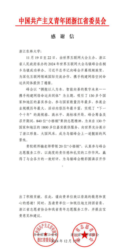 近日,共青团浙江省委、浙江省志愿者协会向beat365官网发来感谢信,向beat365平台唯一官网支持2024年世界互联网大会乌镇峰会工作表示衷心感谢。