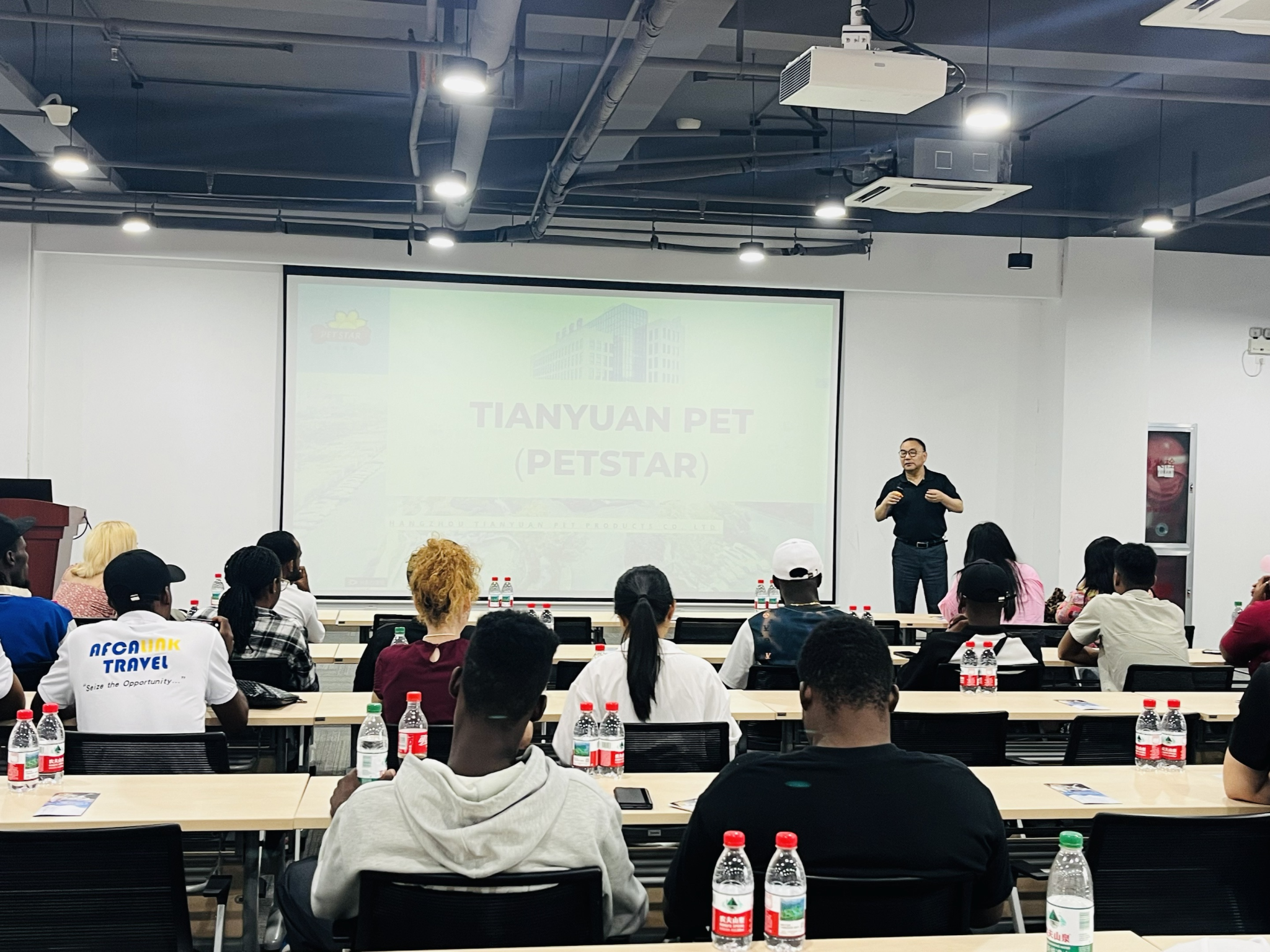 活动中,国际生参观了杭州天元宠物用品股份有限公司和浙江海正动物保健品有限公司的产品展示区与生产实验车间。通过听取两家公司的业务介绍、产品生产流程与市场销售情况,学生们对相关行业有了直观认识,并积极互动交流,探讨未来开展学生实习和跨境电商业务等方面合作的可能性。