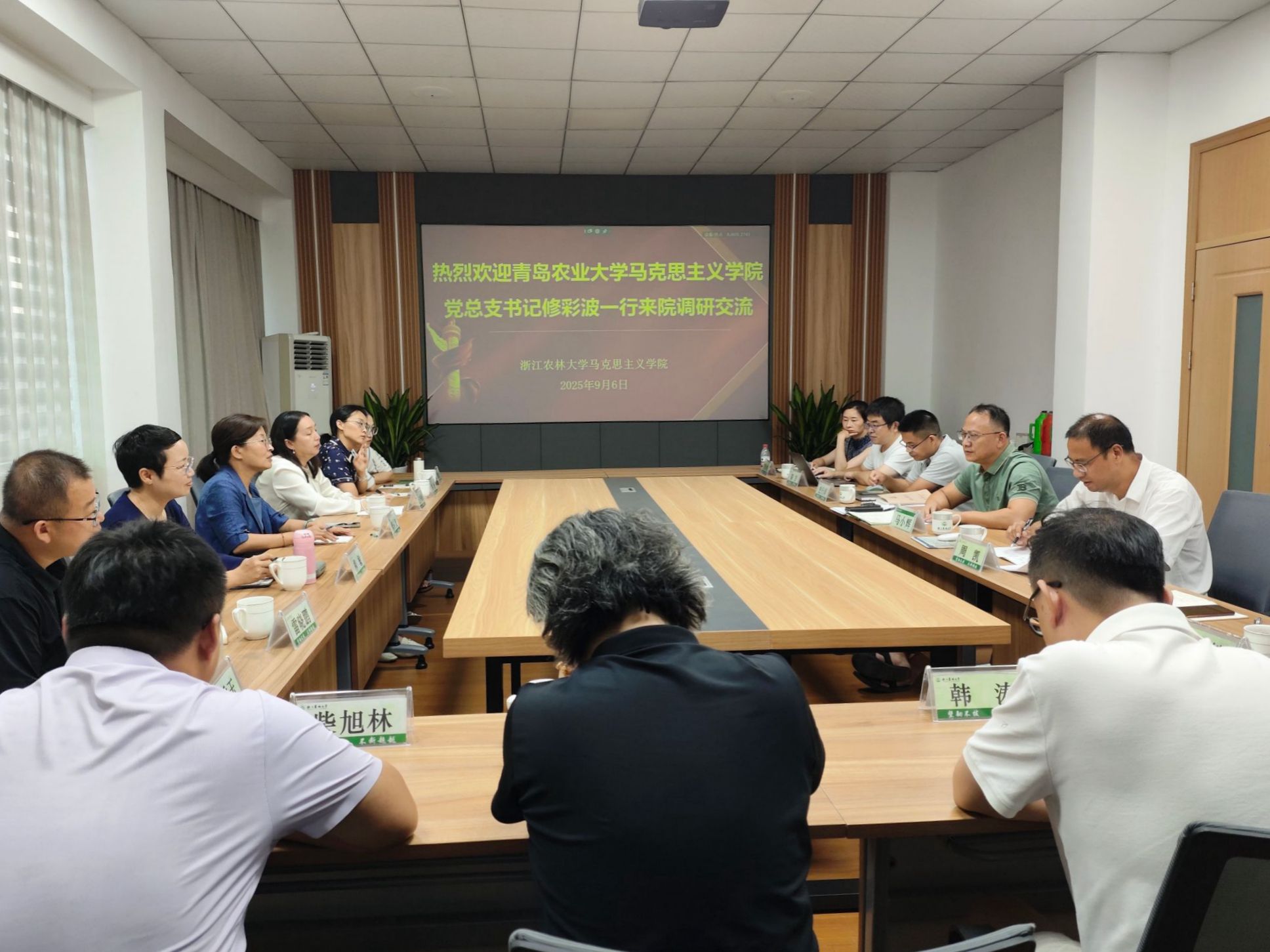 9月6日,青岛农业大学马克思主义学院党总支书记修彩波一行来马院调研交流。院长马小辉、党总支书记周凯,学术副院长及各教研室、办公室主任参加了交流座谈。