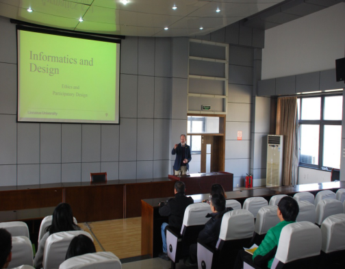 Jeff Winter副教授从“当你想到设计、开发和使用信息交流系统的时候你首先想到的是什么?”引出主题,阐述了系统分析和开发、交互设计/用户为中心设计,围绕技术与变革、技术与分析能力、大数据时代中如何进行道德评价等方面作了详细介绍,并就师生们在实际运用中遇到信息技术问题进行了互动交流。