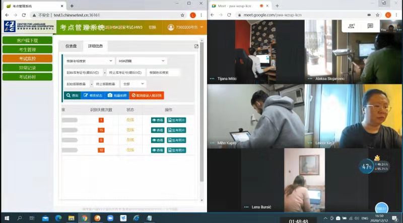 为合理有序地应对新形势下的考试新模式,诺维萨德大学孔子学院按照汉考国际的要求和《居家网络考试管理手册》的规定,多次组织召开考前会议,全体教师积极参加相关培训,认真学习考试系统的操作规范,预估突发事件并商讨出处理办法。在考前一个星期内,孔子学院分级别给考生举行了多次培训,针对考生客户端下载、模拟测试、考试环境检测等方面,对考生进行远程指导与沟通,解答考生的问题,确保每位考生熟知考试当天流程与操作。