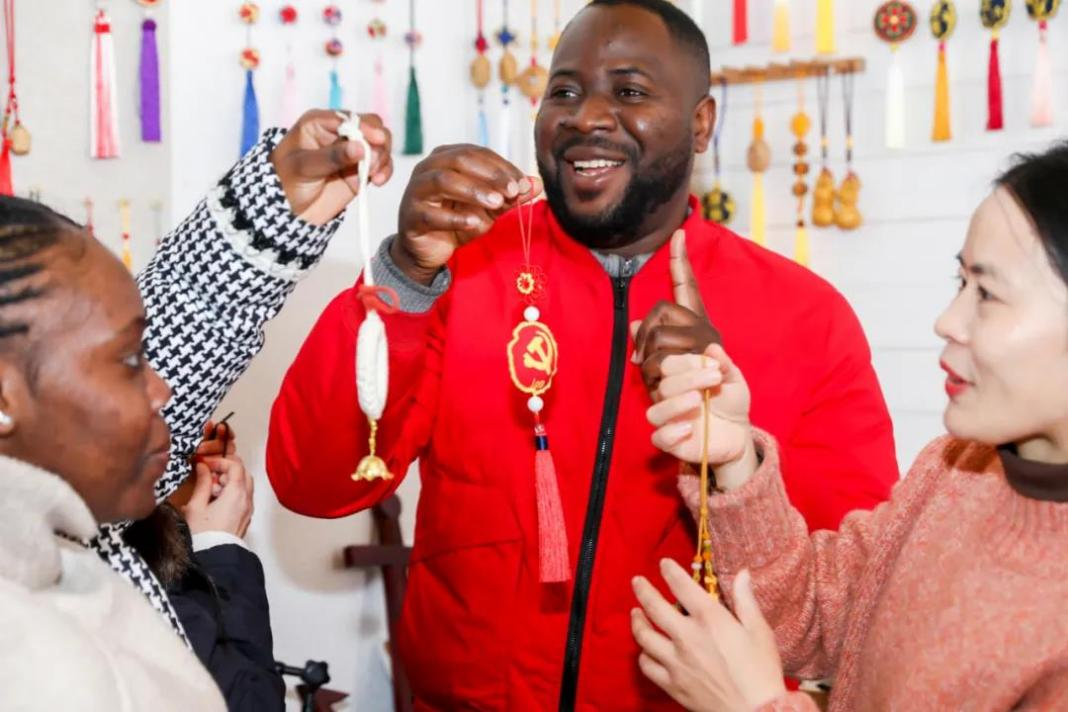 双庙村的乡村田家体验点也是年味儿十足,留学生目睹着土鸡煲、土猪肉等乡村“一桌菜”的烧制过程,现场制作手工艺花环、品尝传统美食、体验传统手艺。